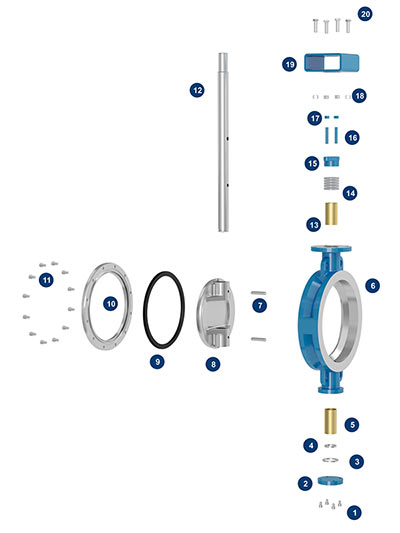 、防靜電:由于閥座采用聚四氟乙烯等非金屬材料,致使蝶板與閥座在啟閉過程中會產生靜電,靜電積累會產生安全隱患,在結構上采用限位套結構將蝶板上的靜電通過限位套傳遞到閥體上,同時在閥體上設置防靜電螺栓與地面接觸,從而達到消除靜電積累的目的。