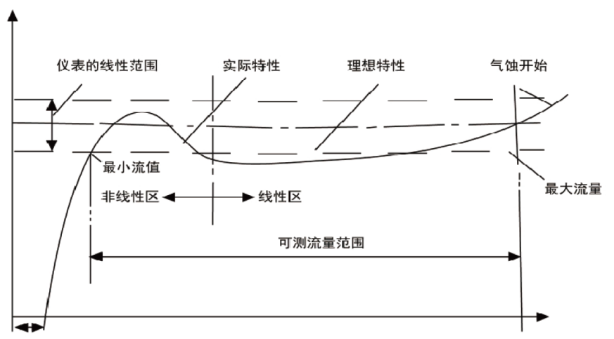 流量計(jì)的系數(shù)與流量(或靂諾數(shù))的關(guān)系曲線如下圖所示。 由圖可見, 儀表系數(shù)分為二段, 即線性段和非線性段。 線性段約為其工作段的三分之二, 其特性與傳感器結(jié)構(gòu)尺寸及流體粘性有關(guān)。非線性段特性受承軸摩擦力, 流體粘性阻力影響較大。 當(dāng)流體量低于傳感器流置下限時(shí), 儀表系數(shù)隨著流噩迅速變化。 當(dāng)流噩超過流噩上限時(shí)要注意防止氣蝕現(xiàn)象。