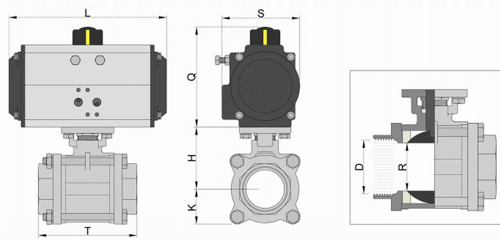進口氣動不銹鋼三片式球閥外形尺寸