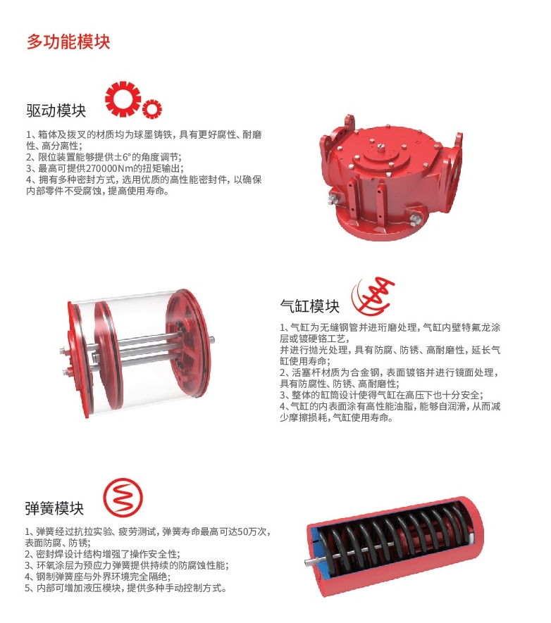 BTS系列氣動執行器可拆分為驅動模塊、氣缸模塊、彈簧缸模塊、手動裝置等獨立模塊,根據客戶個性化需求進行安裝、維修。